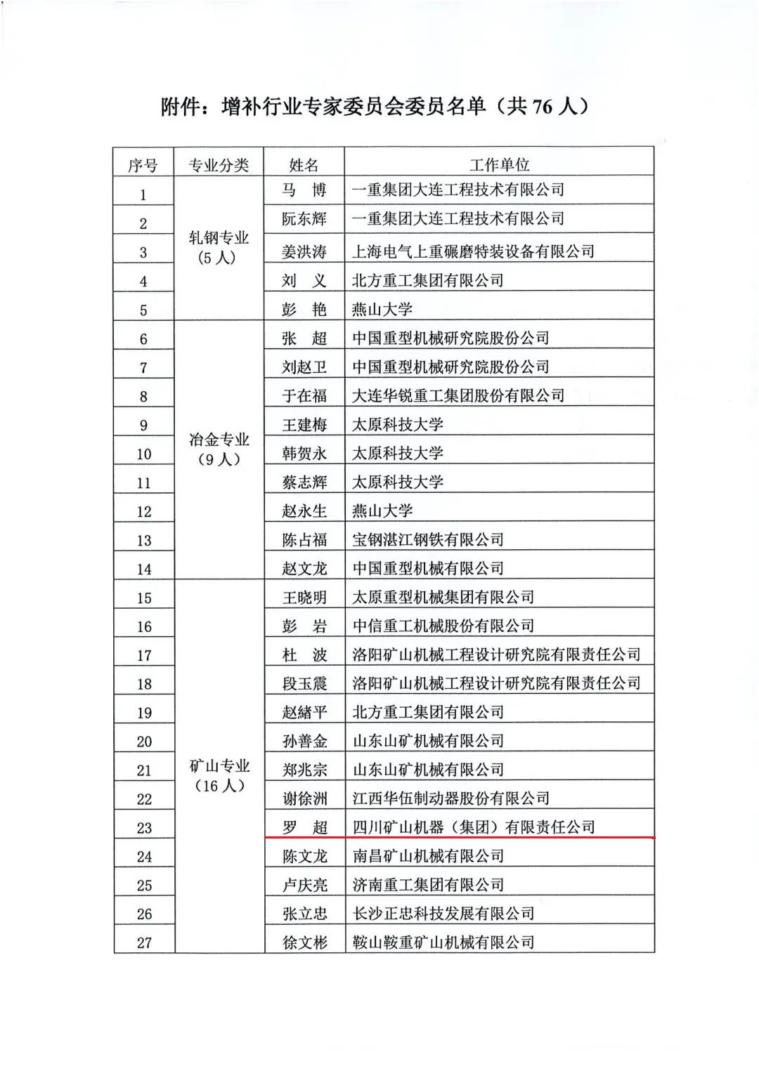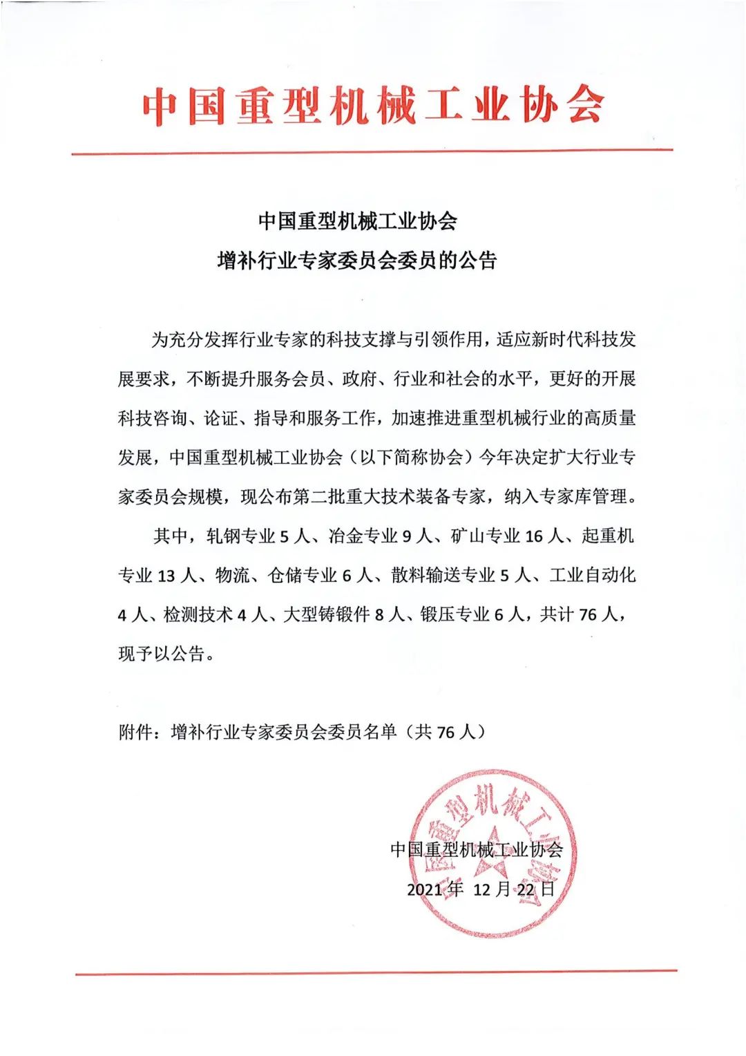 中國重型機(jī)械工業(yè)協(xié)會(huì)增補(bǔ)行業(yè)專家委員會(huì)委員的公告